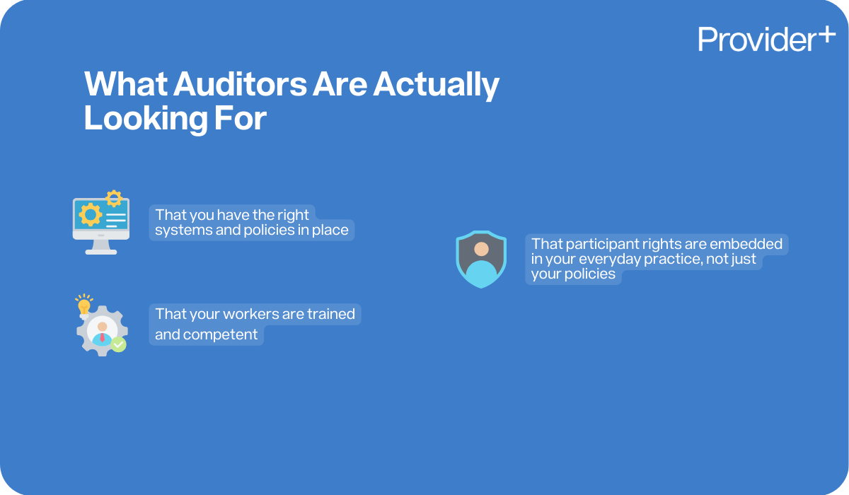 3. That participant rights are embedded in your everyday practice, not just your policies. This is the dimension most providers underestimate. It's not enough to say "we respect participant rights." Auditors want to understand how participant choice, control, dignity, and cultural responsiveness show up in your day-to-day operations.