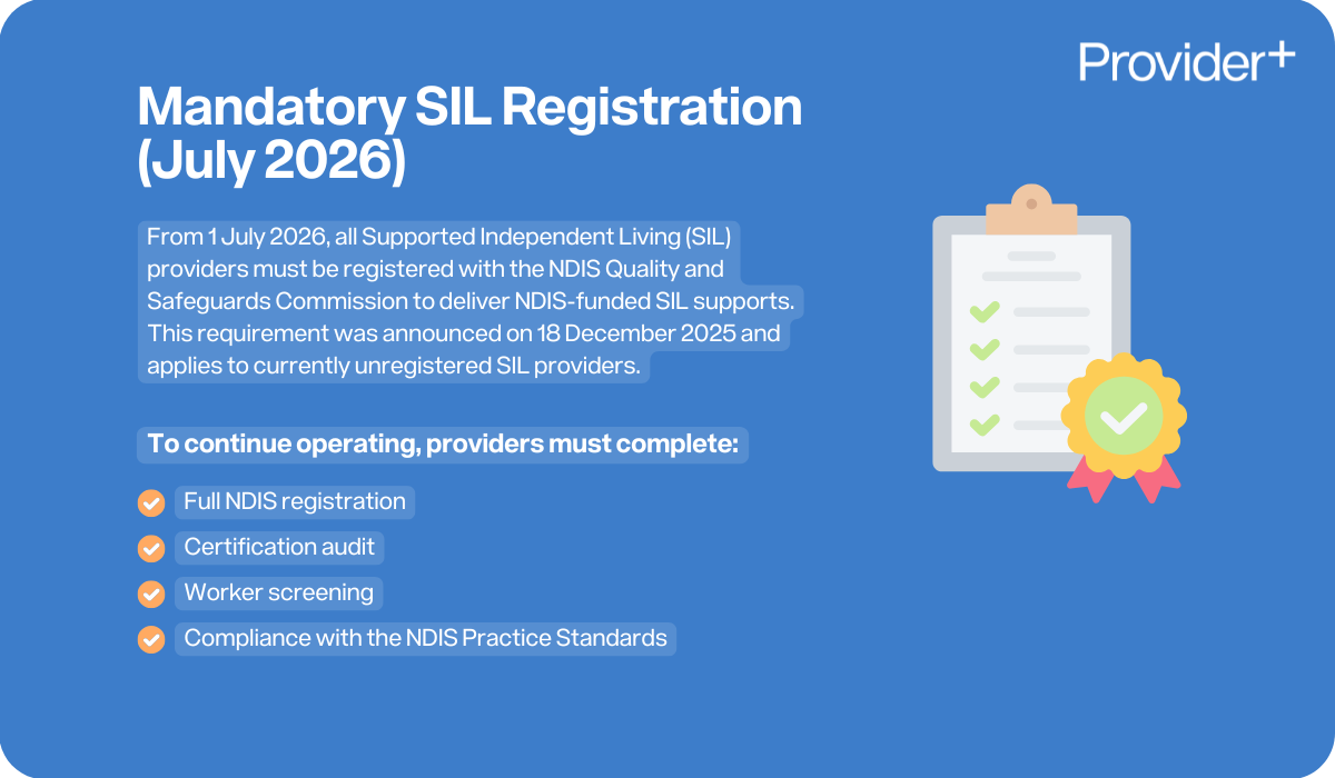 Mandatory SIL registration is a regulatory change requiring every provider delivering Supported Independent Living services under the NDIS to register with the NDIS Quality and Safeguards Commission. Previously, unregistered providers could deliver SIL supports to self-managed or plan-managed participants without registration. After 1 July 2026, this is no longer permitted.