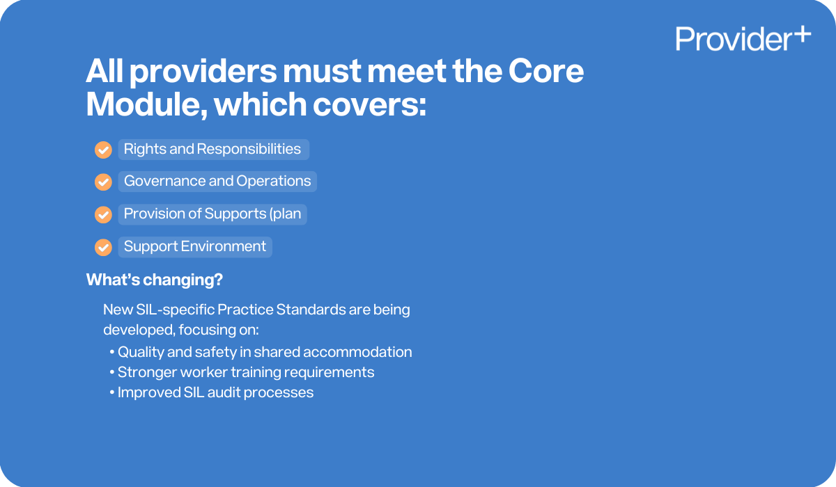 Registered SIL providers must comply with the NDIS Practice Standards. The Core Module applies to all registered providers, covering four outcome areas: