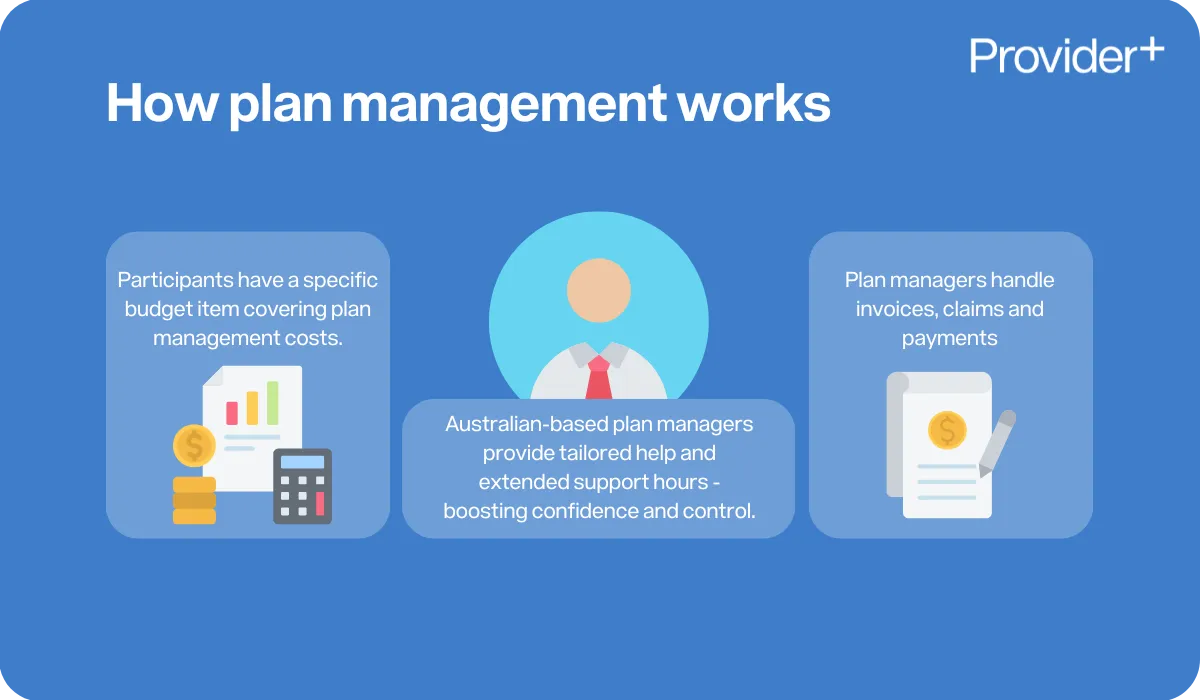 Participants who choose plan management will have a dedicated budget line item in their plan to cover the cost of the service. Thatβs important. Plan managers donβt take a cut from other supports.