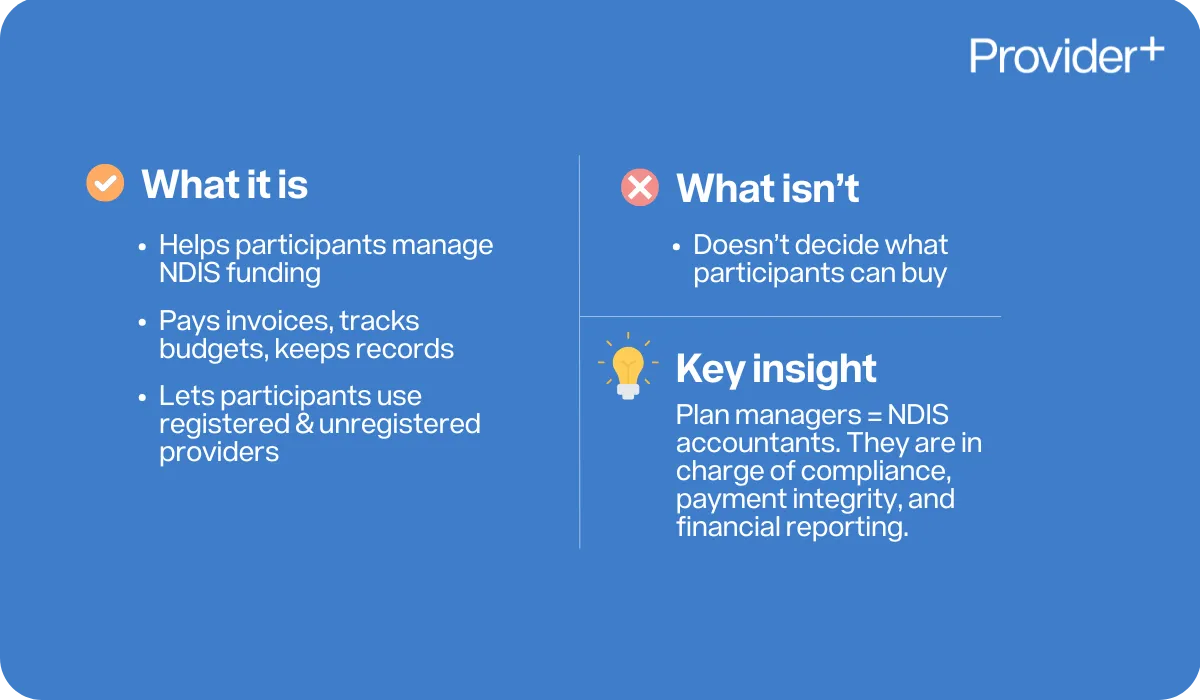 A plan manager is a registered provider who handles the financial side of a participantβs plan. This includes paying invoices, tracking budgets, and keeping records. What they donβt do is decide what the participant can buy. That is the NDIAβs job when the plan is set. NDIS experts provide personalised support and insightful advice, helping participants navigate their plans effectively.