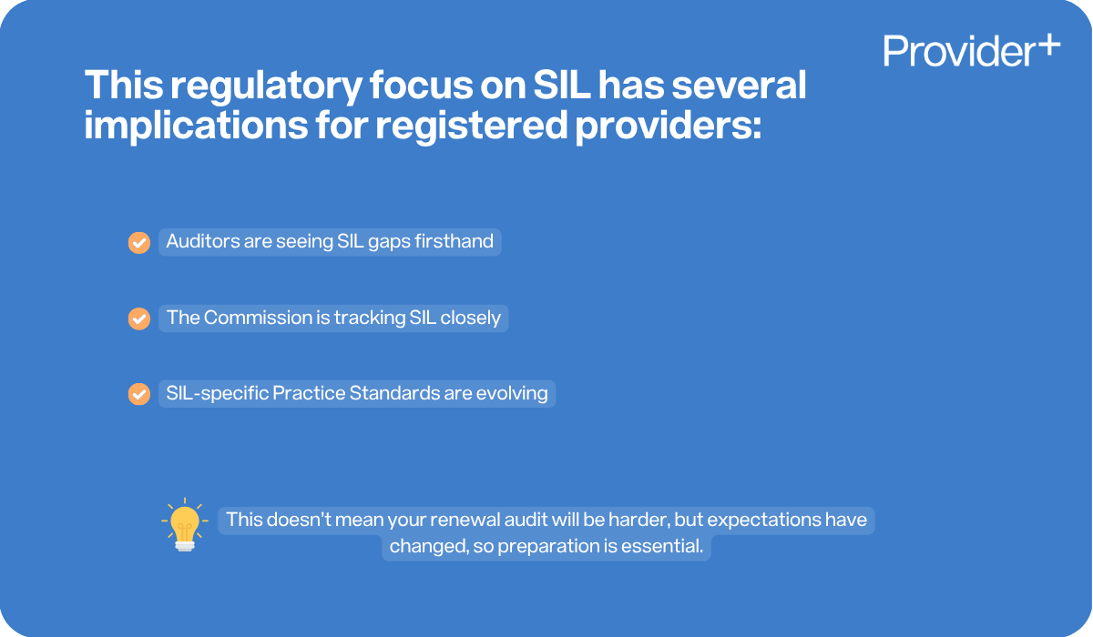 SIL-specific Practice Standards are evolving. The Commission has flagged that new SIL-specific standards will focus on participant-centred outcomes, human rights, privacy, worker training, and participant safety. Renewal audits may reflect these evolving expectations once the new standards are finalised.